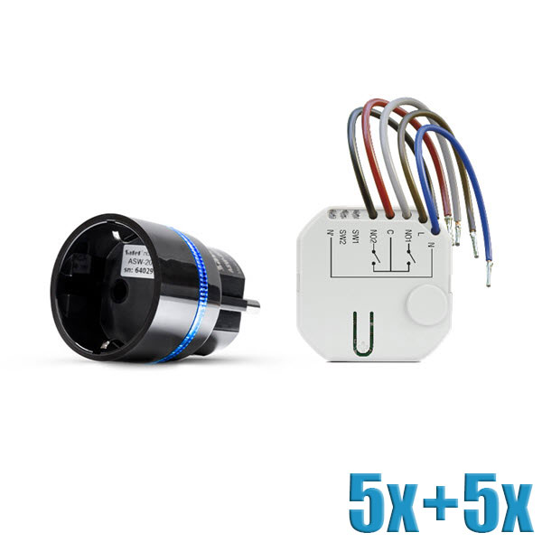 Home Automation Pack - 5 stuks ASW-200 F / Smart Plug, zwart en 5 stuks ASW-210 tweekanaals 230 V AC inbouw controller