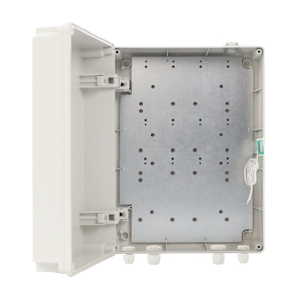 De behuizing is voorzien van een sabotageschakelaar voor detectie op het alarmsysteem, 4 wartels voor waterdichte kabelinvoer met knockouts in de behuizing, geassembleerde deurscharnieren voor eenvoudig openen van de deksel (ook op hoogte), montagebeugels zodat er geen gaten in de achterkant geboord hoeven te worden en een ontluchter die voorkomt dat er vocht in de behuizing achterblijft na het openen.