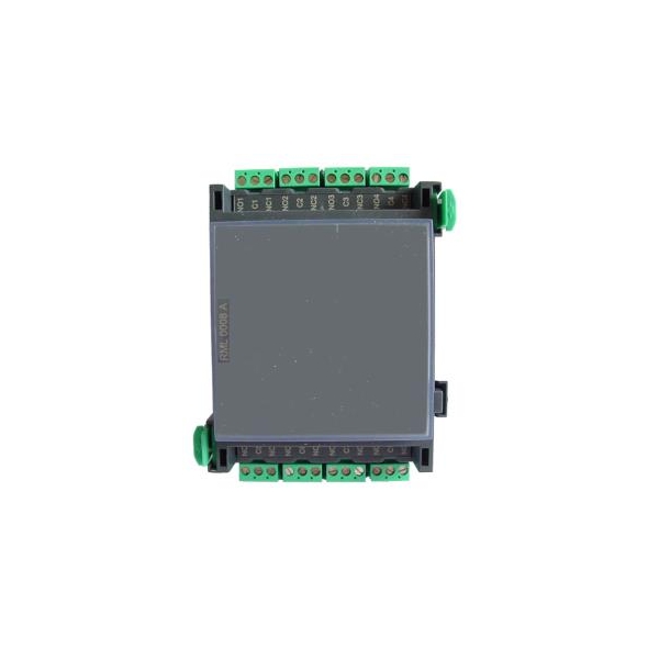 De RML 0008 A Relaismodule is een veelzijdige module die is uitgerust met acht vrij programmeerbare wisselcontactrelais (type C) voor laagspanningssystemen. Elk relais biedt potentiaalvrije uitgangscontacten met een NO-C-NC-configuratie (normally open, common, normally closed). De maximale belasting van elk relaiscontact bedraagt 30 V DC bij 1 A.